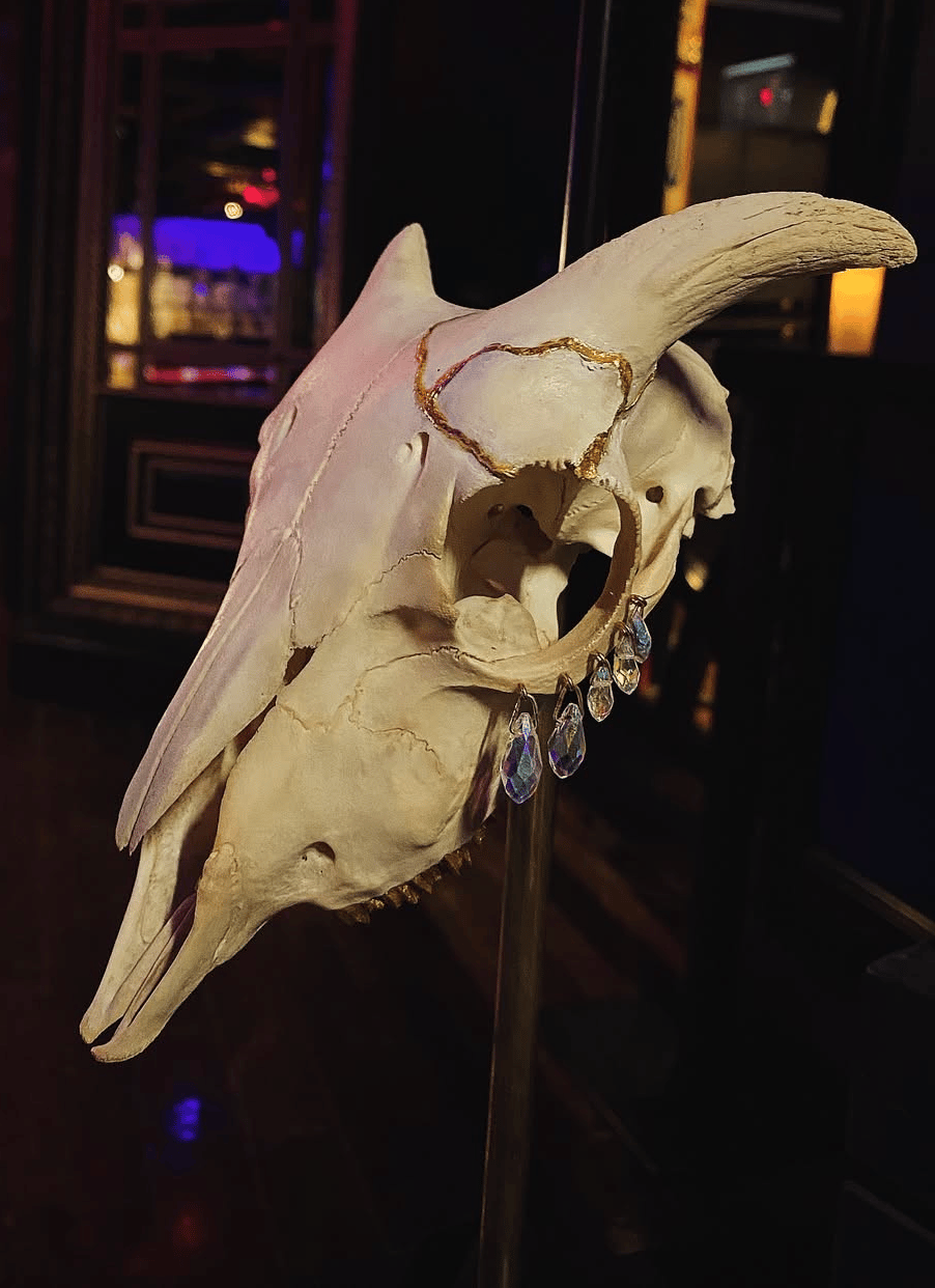 Sheep skull with 24ct gilded teeth and kintsugi crack, adorned with iridescent crystal tears on a concrete stand.