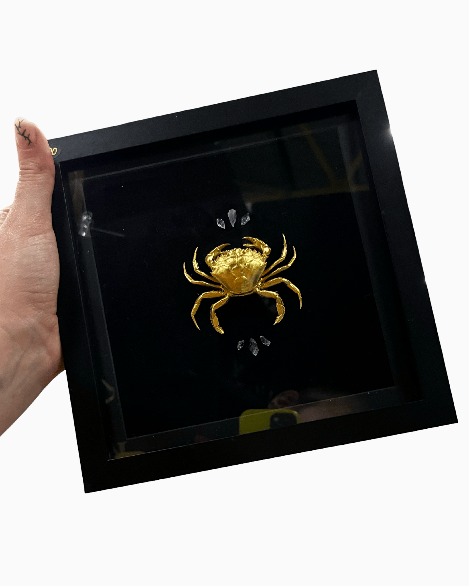 Crab gilded with quartz on velvet in 18x18cm frame with glass