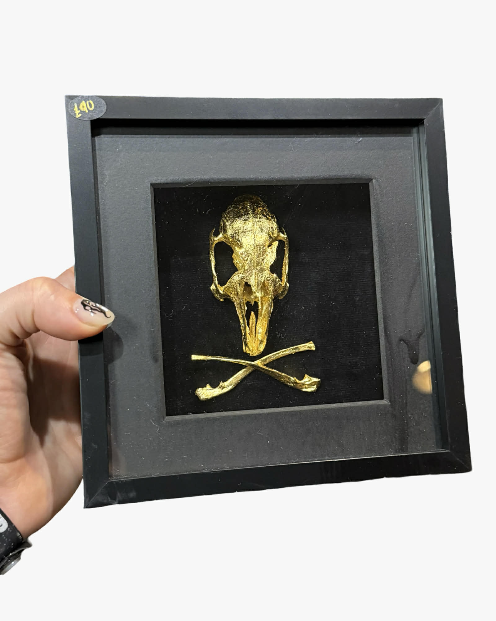 Rabbit skull fully gilded in 24ct gold leaf, on velvet, in 6" x 6" deep frame with glass