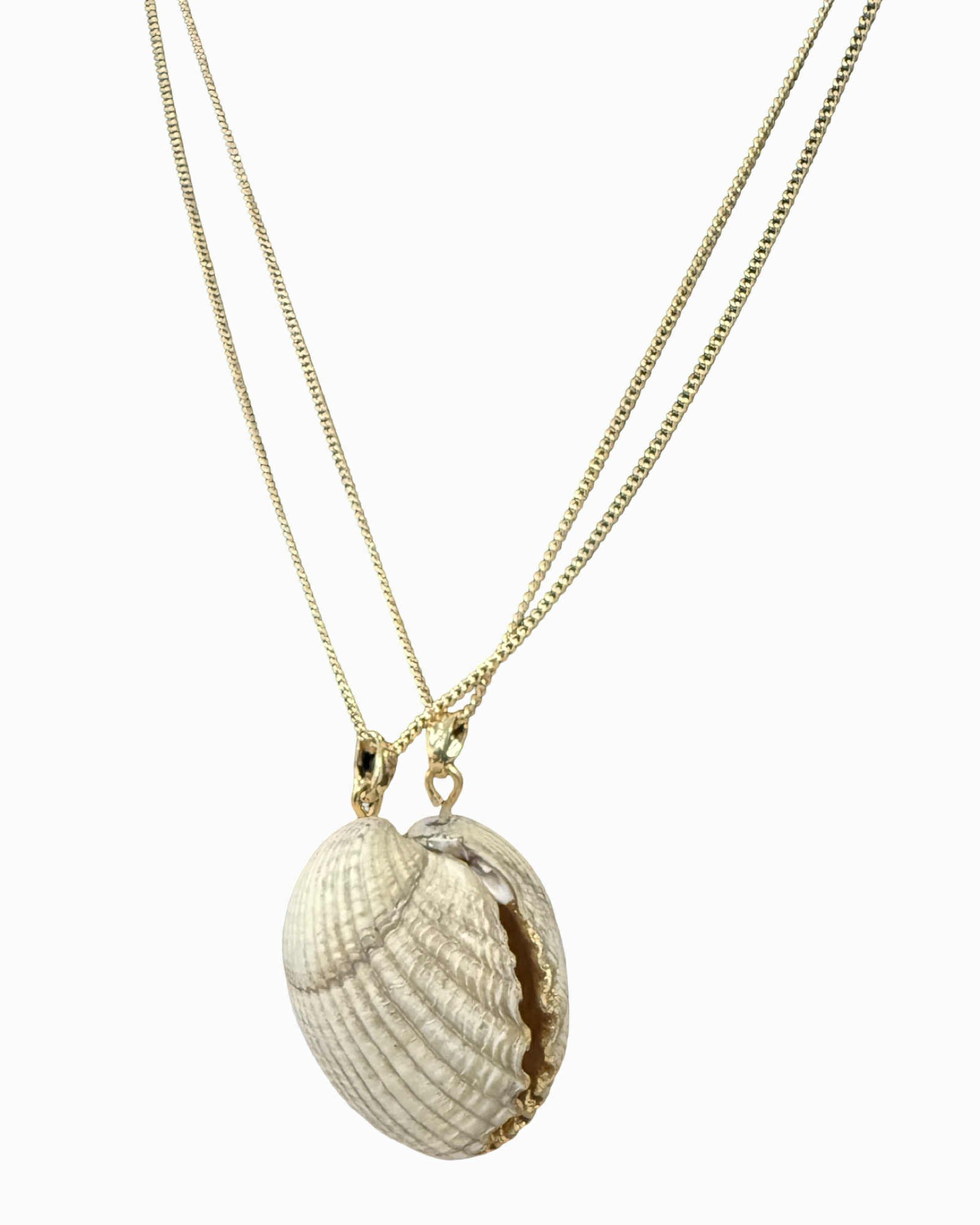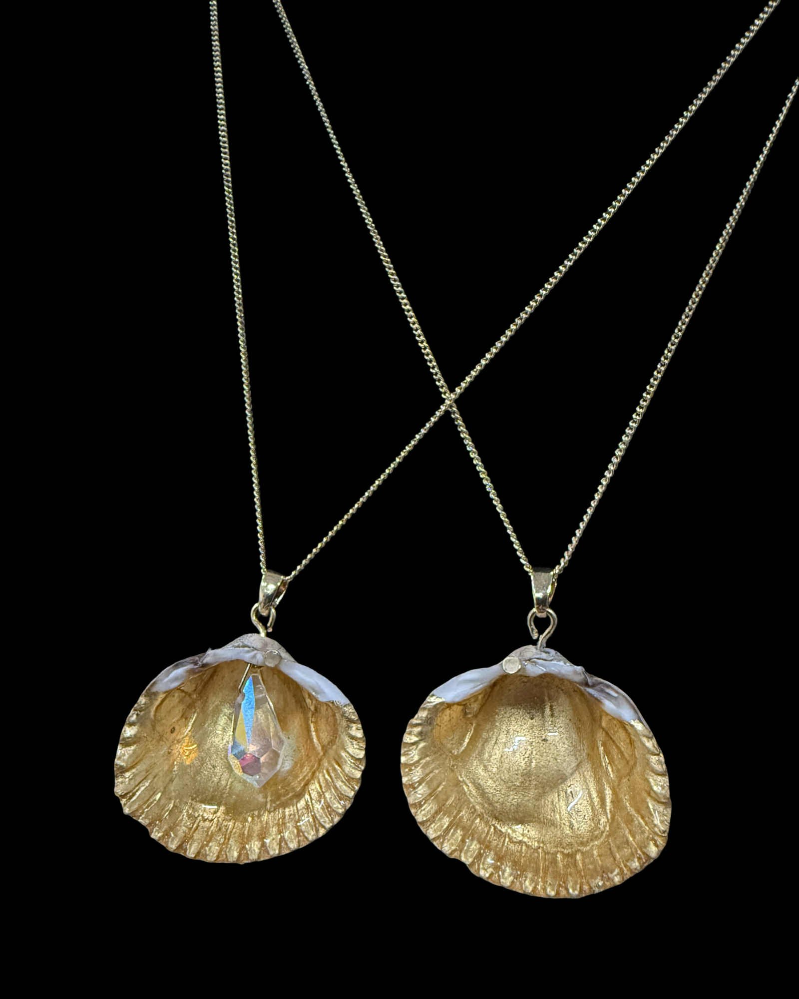 Get you and your bestie/lover matching cockle necklaces with gilded interiors and a magnet that joins together! One also has an iridescent crystal hanging which refracts rainbows on to the golden surface.